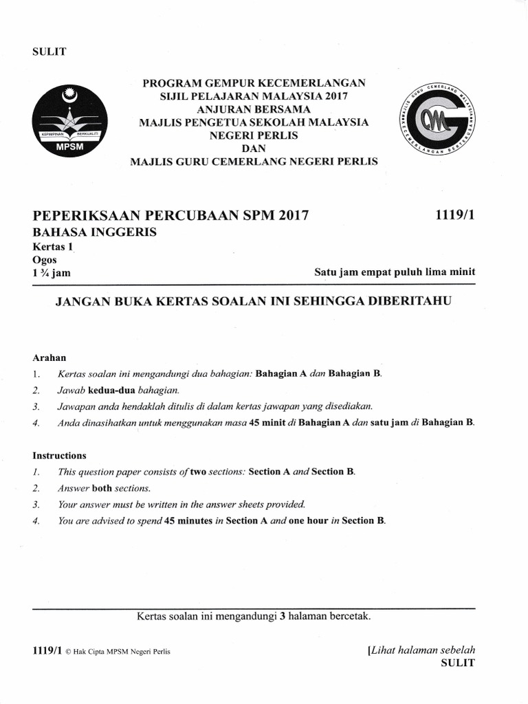 Soalan Percubaan Spm 2017 Bahasa Inggeris Negeri Perlis Kertas 1 Pdf Pdf